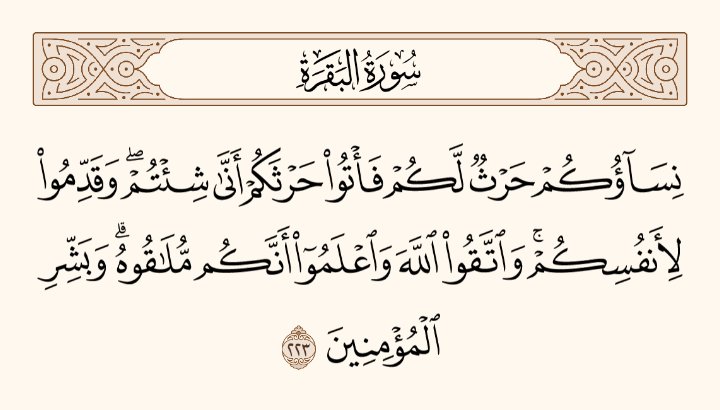 ﴿نِساؤُكُم حَرثٌ لَكُم فَأتوا حَرثَكُم أَنّى شِئتُم وَقَدِّموا لِأَنفُسِكُم وَاتَّقُوا اللَّهَ وَاعلَموا أَنَّكُم مُلاقوهُ وَبَشِّرِ المُؤمِنينَ﴾ [البقرة: ٢٢٣]