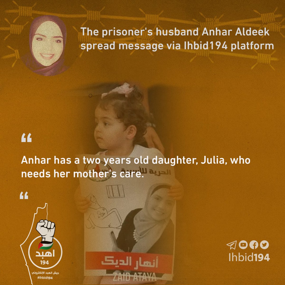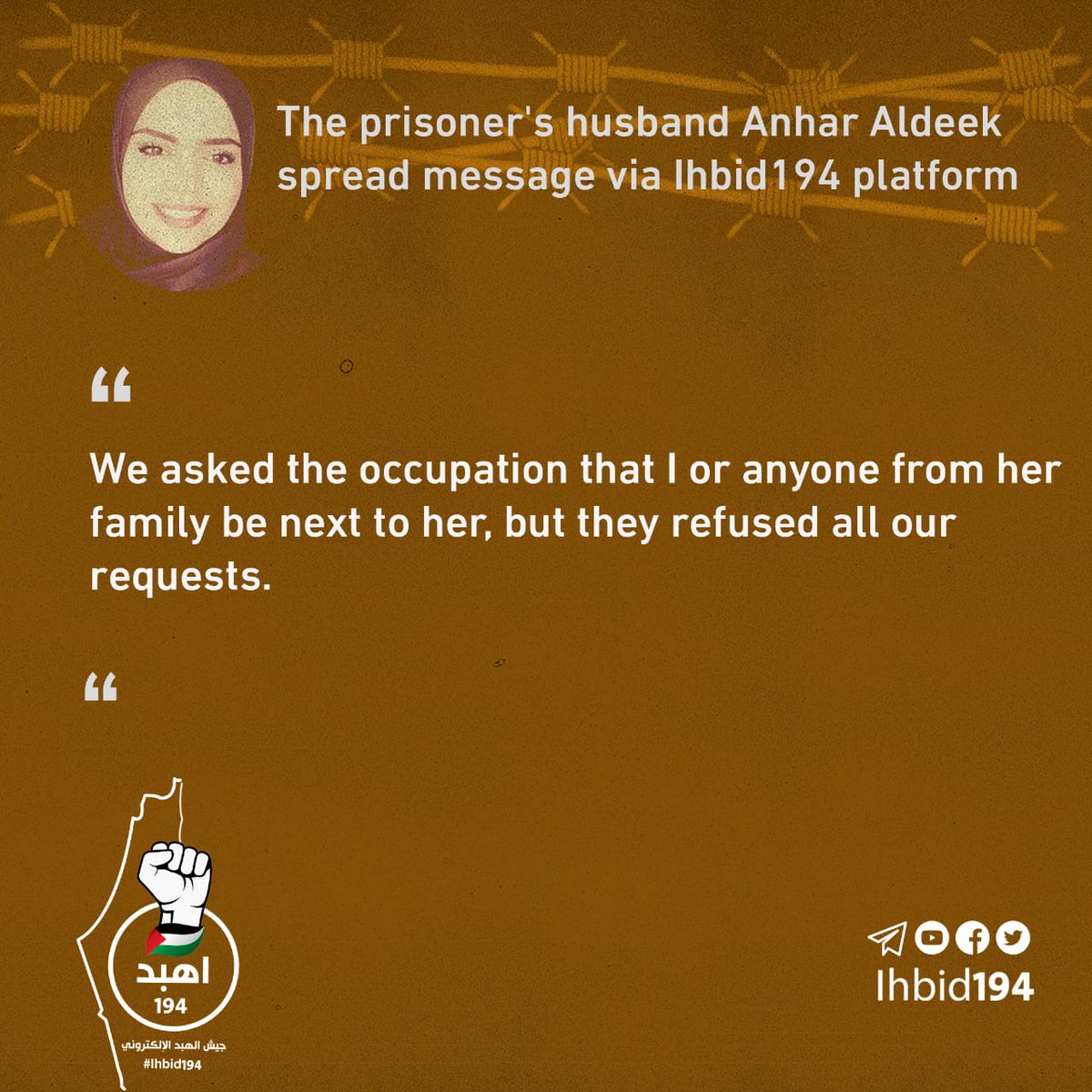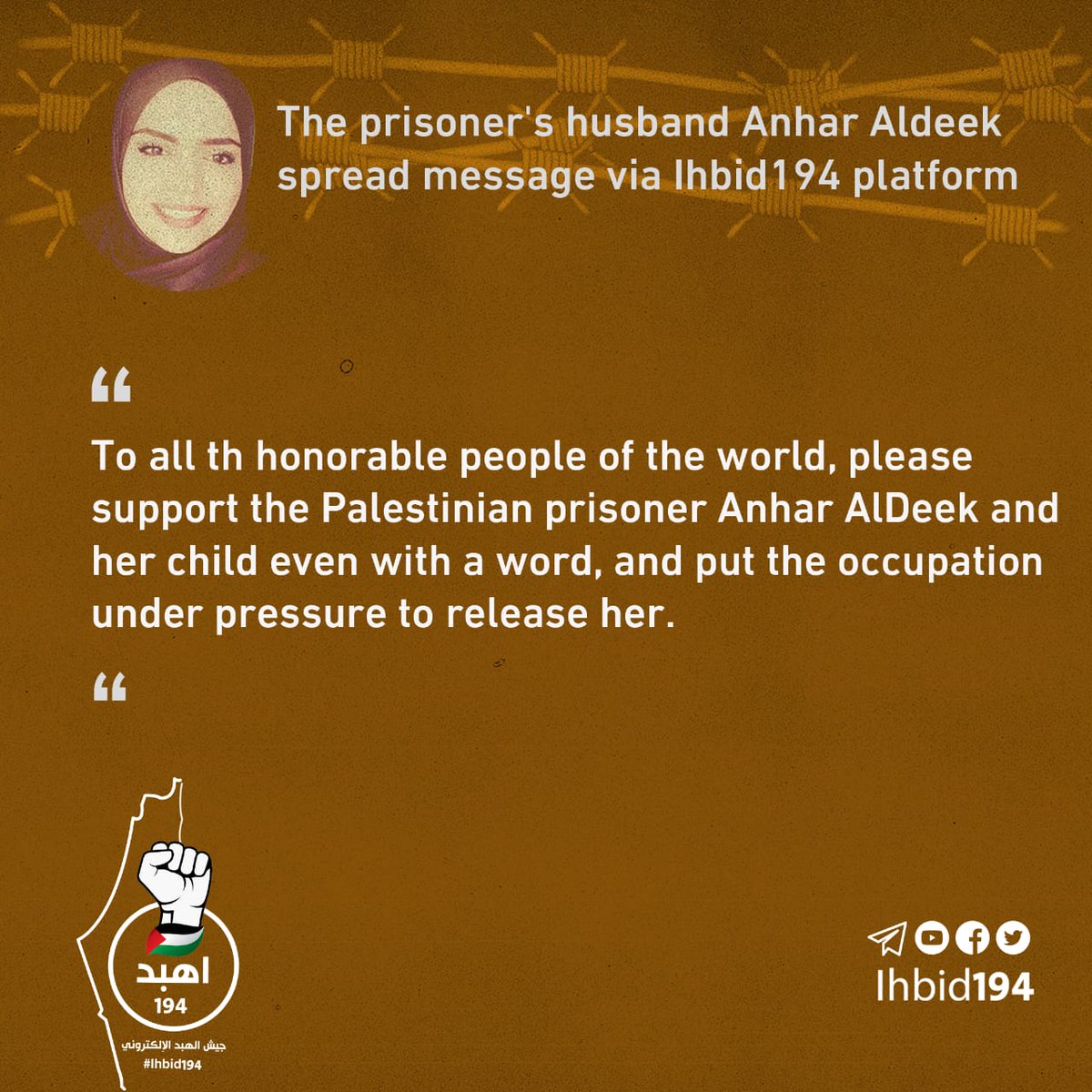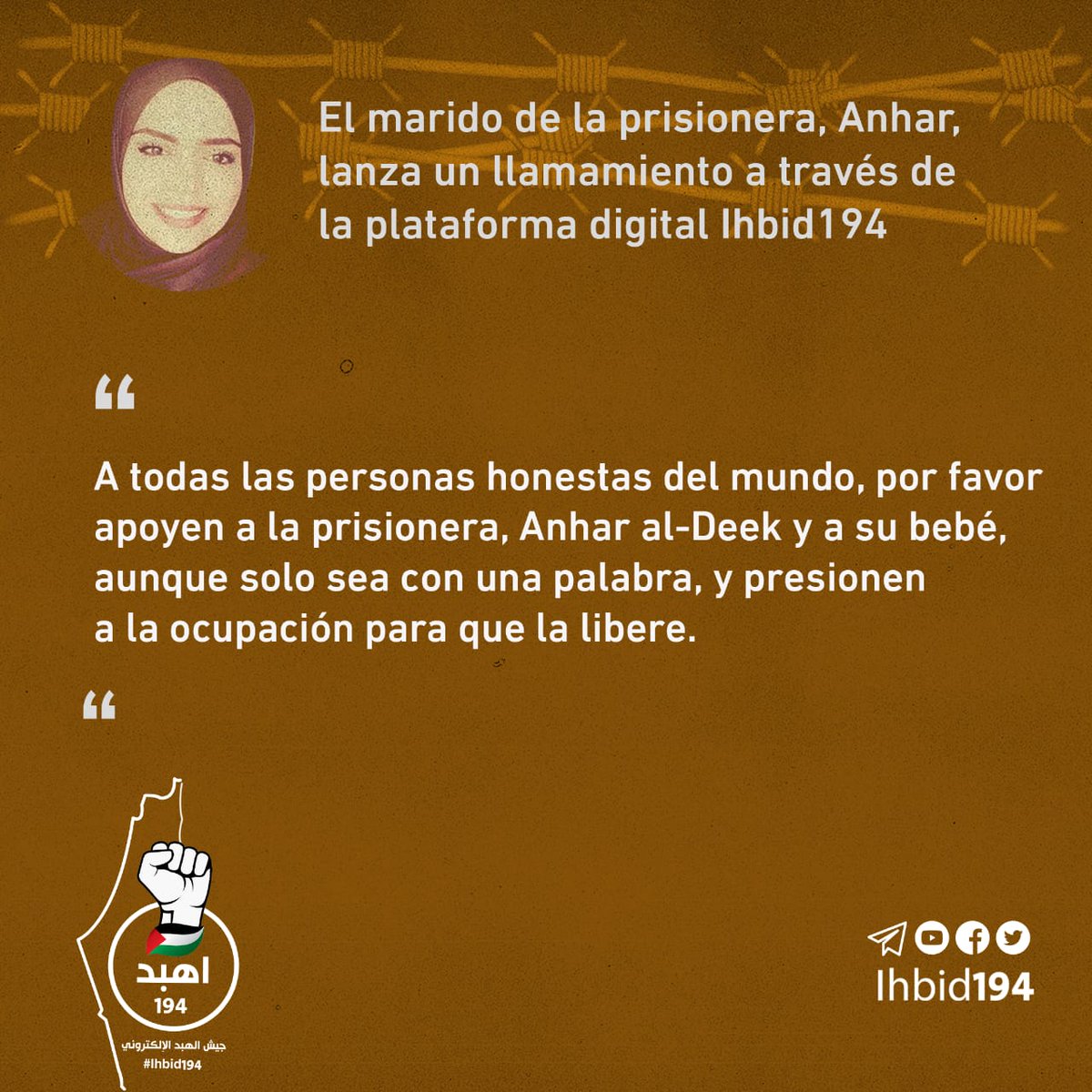 صرخة ألم من عائلة أسـ۔ـيرتنا البطلة أنهار الديك لأحرار العالم عبر منصة جيش الهبد الإلكتروني،قمنا بترجمتها للغة الإنجليزية والإسبانية.