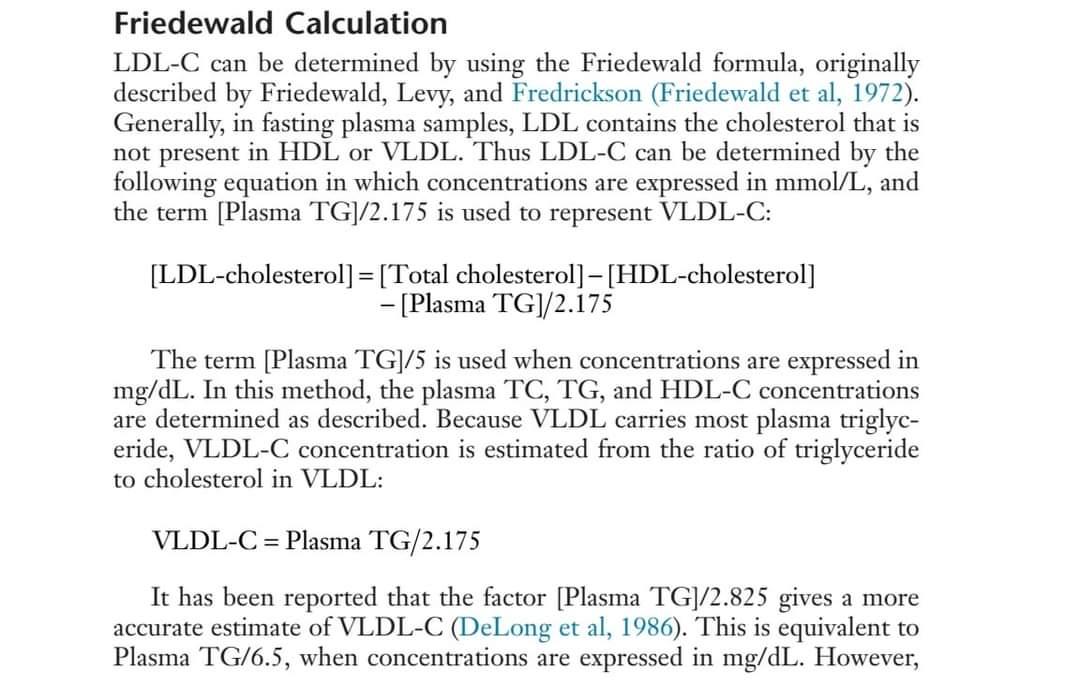 *** اخيرا: الابحاث الحديثه بتقول ان المعادله مش بالدقه الكافيه (بغض النظر عن مستوى التراي) و انها (underestimates) مستوى ال LDL يعنى بتطلعه اقل من الحقيقه و بذلك ممكن المريض ياخد نتيجه طبيعيه رغم وجود risk لامراض القلب