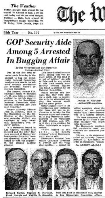 واشنطن، منتصف ليل السابع عشر من يونيو 1972، فرانك ويلز حارس أمن مجمع ووترغيت لاحظ وجود شريط لاصق على مزلاج الباب الخلفي يمنع إحكام غلقه، أزال ويلز الشريط ومضى، لكن مع عودته مجددا رأى الشريط اللاصق وقد عاد على نفس الباب بإحكام أكبر، لم يتردد ويلز في الاتصال بالشرطة