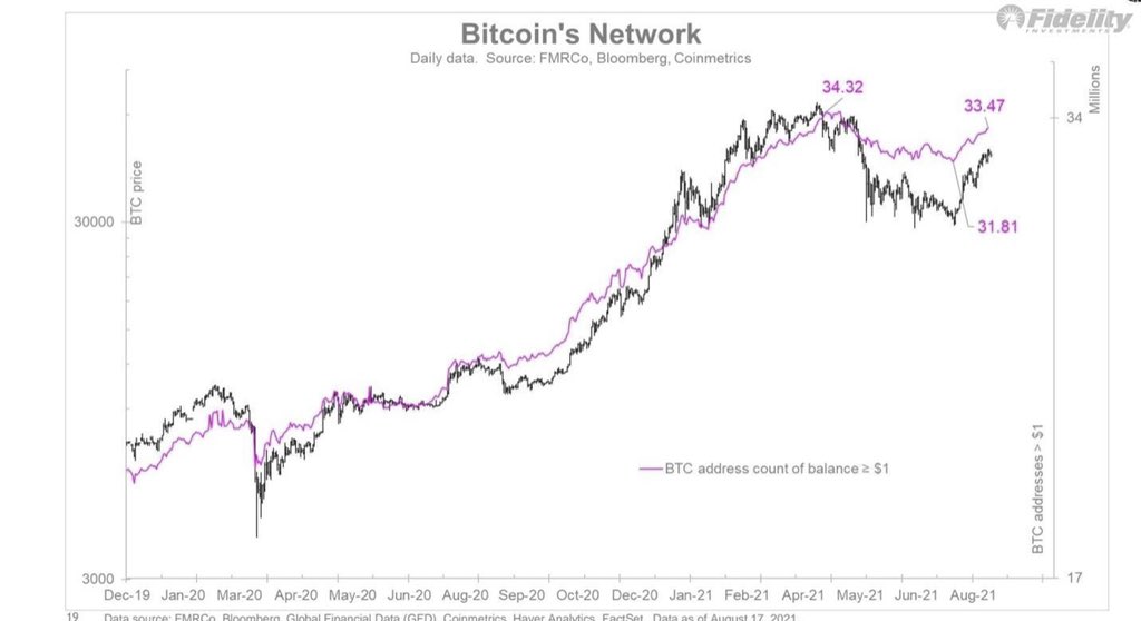 ٣- الطلب على #البتكوين يتضح من نمو المحافظ برصيد اكثر من دولار واحد لمستخدمي الجوالات، وبالتالي يُظهر مسار نمو سريع ولكنه ثابت