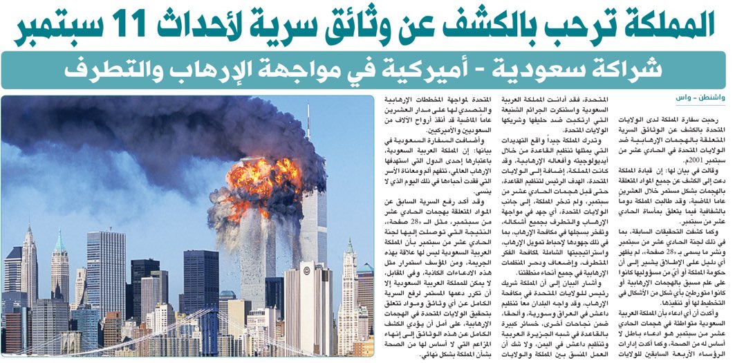 لااريد ان اطيل ولكن امريكا اذا نشرت الوثائق ستقول ليس لها علاقة فيه قضاء وأسر ضحايا ولتدافع السعودية عن نفسها واذا حكم القضاء على السعودية ان تنفذ الحكم وهم قد وضعوا بند بقانون جاستا بحق لوزير خارجية امريكا عمل تسوية بين أسر الضحايا والدولة المدانة فالامر مطبوخ منذ البداية