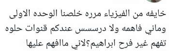في الصف الثاني ثانوي كنت طالبة جديدة التحقت بمدرسة جديدة ببيئة جديدة ومع اني متفوقة جداً لكني تأخرت لمدة شهر في أول يوم دوام لي قالت لي معلمة الفيزياء وش دخلك علمي وبفضل الله من قالت لي هذه الجملة اليوم تتابع تويتري ولا أستبعد قراءتها لهذه السلسلة