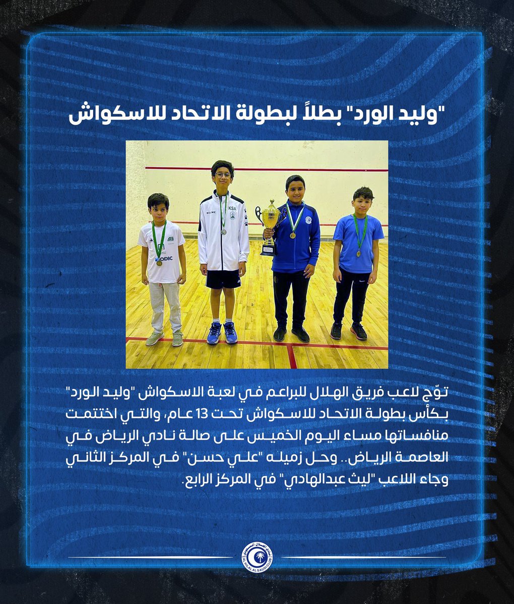 🏆 البطولة 46 حققها لاعب براعم #الهلال في لعبة الإسكواش "وليد الورد"؛ حيث تُوّج بكأس الاتحاد تحت 13 عام والتي اختتمت على صالة نادي الرياض أمس الخميس.