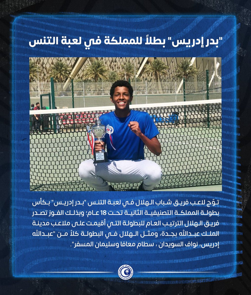 (🎾) حقق لاعب #الهلال "بدر إدريس" بطولة المملكة التصنيفية الرابعة لفئة الشباب تحت 18 عام، والتي اختتمت منافساتها اليوم السبت على استاد الأمير عبدالله بن جلوي بالأحساء.