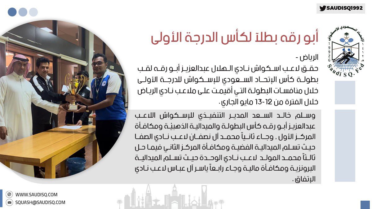 حقق نجم #الهلال "عبدالعزيز أبورقه" كأس الاتحاد السعودي للإسكواش في البطولة التي أقيمت على صالة نادي الرياض، وهي البطولة رقم (15) على مستوى كأس الاتحاد للكبار.