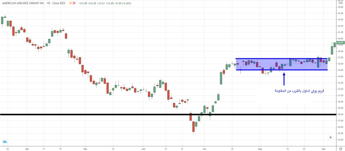 1. يختبر السهم دعم الفريم الأعلى (يمنحك هذا "الحماية" من المشترين الفريم الأعلى أي المستثمرين)