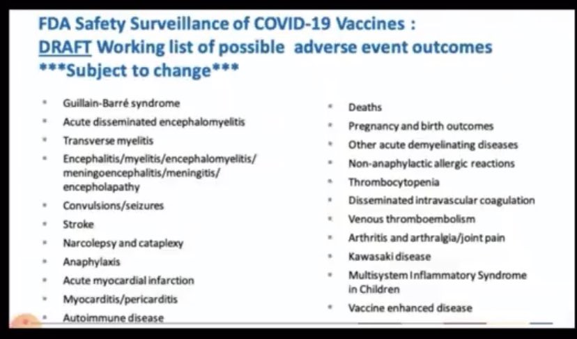 العروض التقديمية التي تم تقديمها من قِبل إدارة الغذاء والدواء الأمريكية لمراقبة سلامة لقاحات Covid-19 ، بإلقاء نظرة على قائمة ما كانوا يعلمون أنه سيبدأ في إبلاغ الحكومة نتيجة لإصابات اللقاح التي تأتي بشكل مثير للاشمئزاز في هذه القائمة. عندما قامت نفس المنظمة ،2️⃣1️⃣