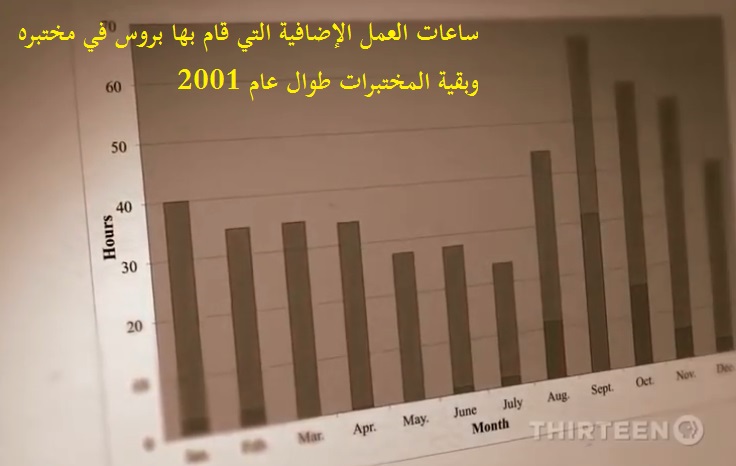وFBI اكتشف أيضاً بأن ساعات عمل بروس في المختبر قد قفزت خلال أشهر أغسطس وسبتمبر وأكتوبر 2001 بما في ذلك في عطلة نهاية الأسبوع، وليس قبل ذلك ولا بعده، وهو ما أشار لهم بأن ذلك يدل على أنه كان يقوم بتحضير تلك العينات الجافة من البكتيريا !