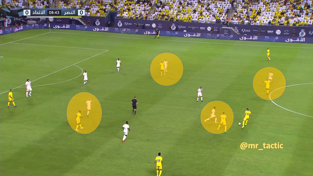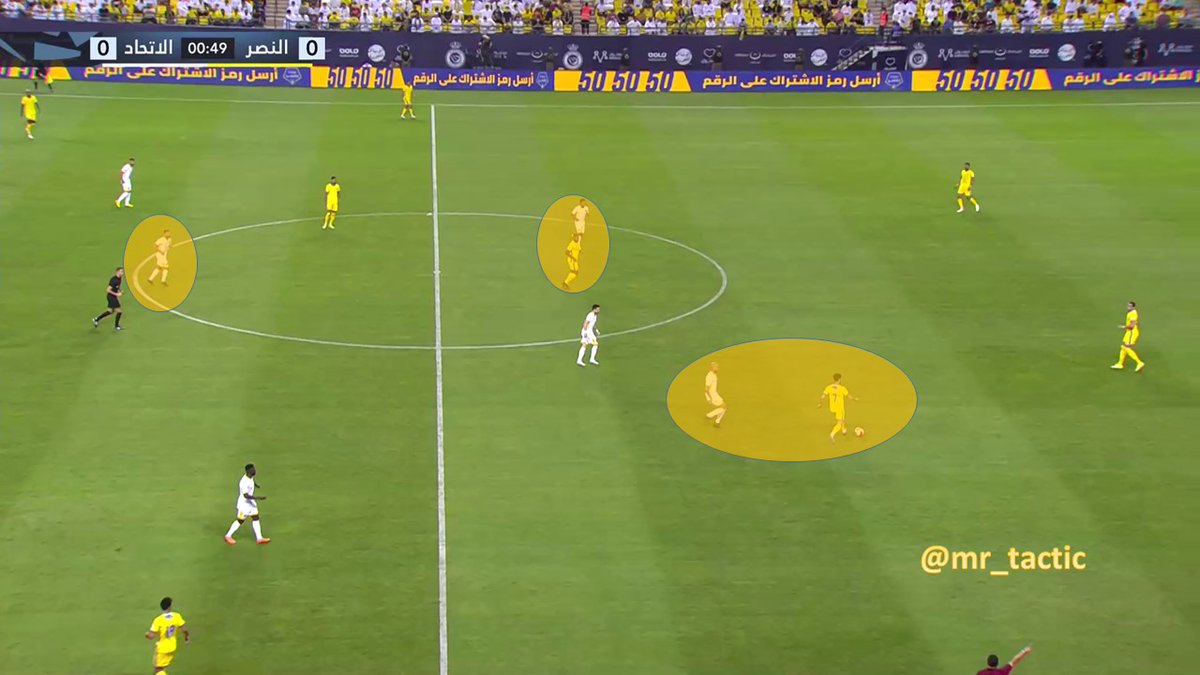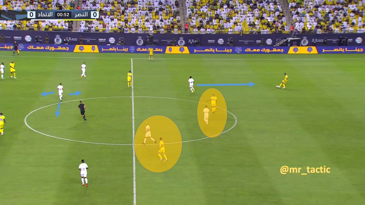 كونترا منذ بداية المباراة كان من الواضح أنه بدون كرة فإن لاعبي الإتحاد يملكون أدوار معينة خاصة بتغطية العمق ومنع لاعبي النصر من التحرك بتلك المساحة خاصة ماشاريبوف وتاليسكا