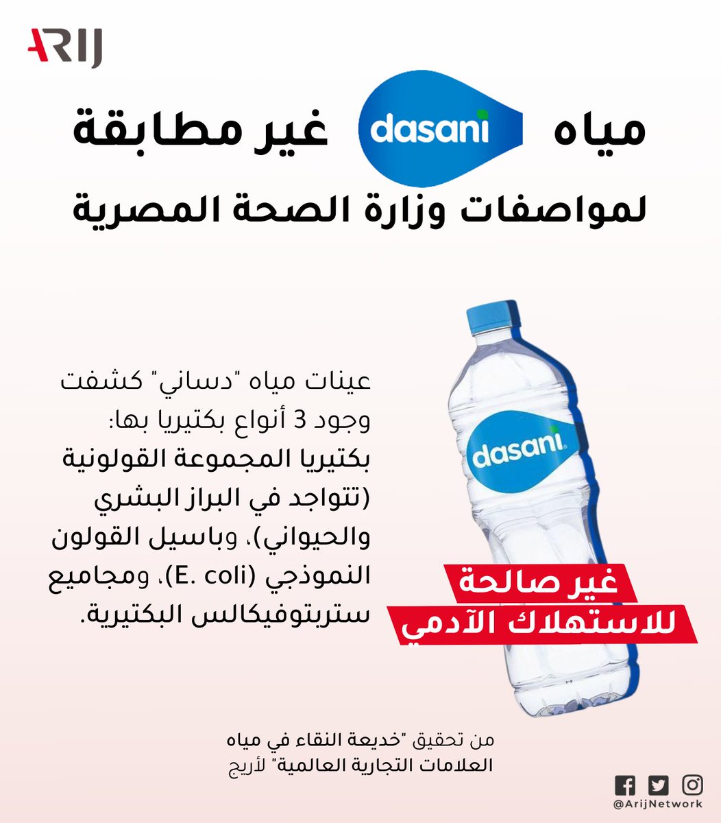 ليست هذه المرة الأولى التي تخالف فيها شركات المياه المعبأة قرارات وزارة الصحة في #مصر، ففي 2016 أجرت الوزارة تحليلات لمياه 'أكوافينا' و'نستله' و'بركة' وتبين أن العينات "غير مطابقة للفحص المجهري، وليست صالحة للاستهلاك الآدمي لاحتوائها على بكتيريا حية وطحالب".