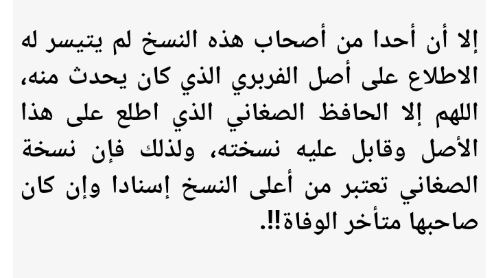 ٥- متزهدًا: نسخه من نسخة كتبت في زمان البخاري رحمه الله، وعليها خط الفربري تغمده الله برحمته، إلا ثلاثة أجزاء كانت قد ضاعت من نسخة الفربري ونسخ بدلها". اهـ. فهذا ما قاله الصغاني نفسه: أنه نسخها من نسخة عليها خط الفربري، ولم يقل أصل الفربري الذي بخطه وفرق بينهما كبير، ونسبتها