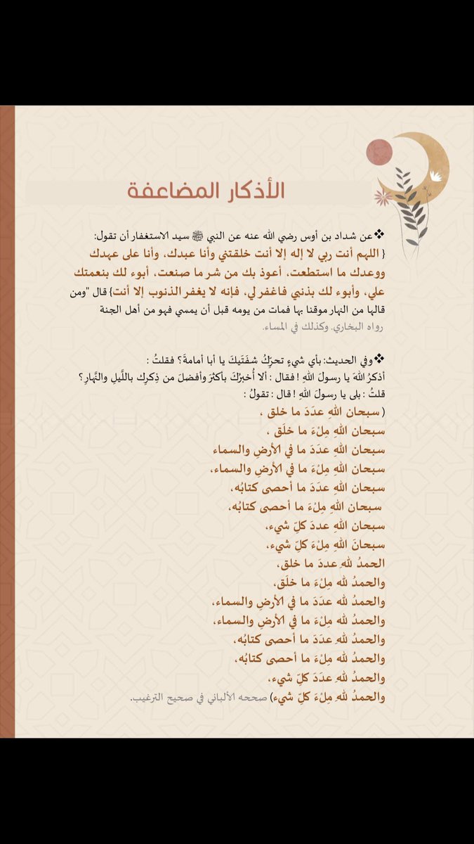 لابد من الإنسان أنه ما يغفل عن الأذكار المضاعفة ويجعلها روتين يومي بشكل متكرر لما فيها من الأجور العظيمة.