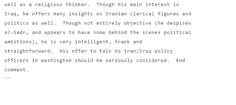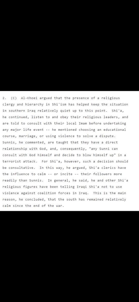 جواد الخوئي خلال كلامه مع ضابط ارتباطه. "المرجعيه الشيعيه ساهمت كثيرا في استقرار الوضع بعد الاحتلال وعدم ضرب الاميركان والسيطره عليهم لان الشيعه يتبعون مراجعهم خلافا للسنه فليس لهم مرجع وتواصلهم مباشره مع الله ، لذلك فليس لدى السنه مشكله في "تفجير نفسهم" وقتل الاميركان " #شريف !