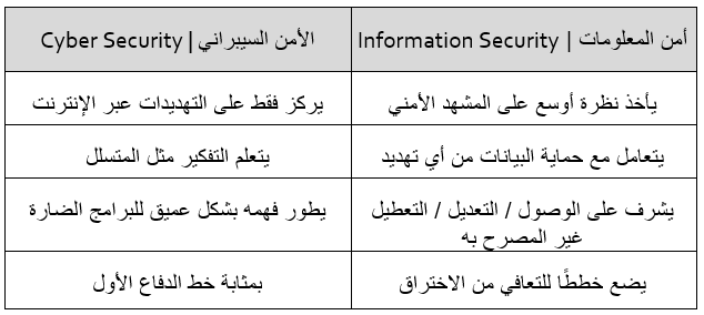 يهدف #الامن_السيبراني إلى الحماية من الهجمات في الفضاء الإلكتروني مثل البيانات ومصادر التخزين والأجهزة وما إلى ذلك. في المقابل ، يهدف #أمن_المعلومات إلى حماية البيانات من أي شكل من أشكال التهديد بغض النظر عن كونها مادية أو رقمية.