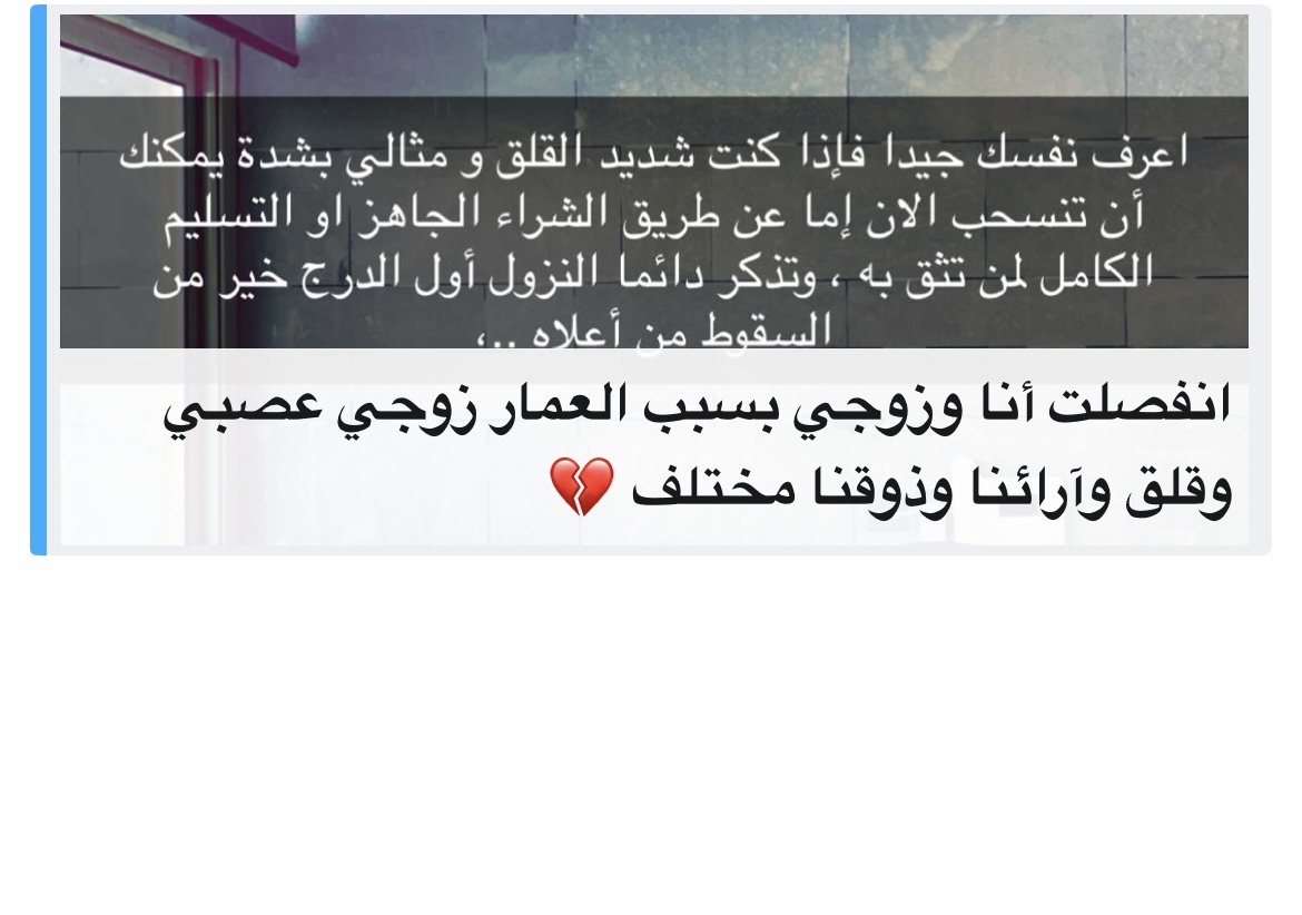 الزوج وتراكم الهموم بين العمل والبيت والاسرة ، وهو لا يحاول أن يوضح مصدر هذا الضغط و العلم يؤكد ان هناك حالات تسمى اضطراب البناء تصل الى الاكتئاب ولأنها تمتد الى اكثر من سنة يشعر بعض الأزواج أن الآخر قد تغير دون سبب ، تجاوزوا .،