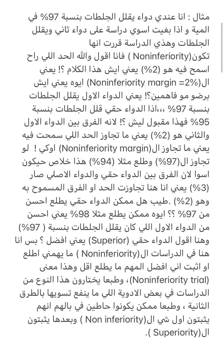 اليوم طنت في راسي اشرح لكم ال(Noninferiority trials) وكيف نفسرها وايش يعني ال(Noninferiority margin ) عشان تفهمون لمن تشوفوا ارتكل مكتوب عليه (Noninferiority trial).💊.