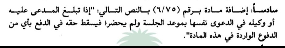 ثانيا: من تبلغ لشخصه أو وكيله بالجلسة الأولى فلم يحضر، فإن حقه في هذه الدفوع الشكلية يسقط بناء على 75/ 06 اللائحة التنفيذية لنظام المرافعات الشرعية المضافة بموجب قرار معالي وزير العدل برقم: 5062 وتاريخ: 07/ 09/ 1440هـ