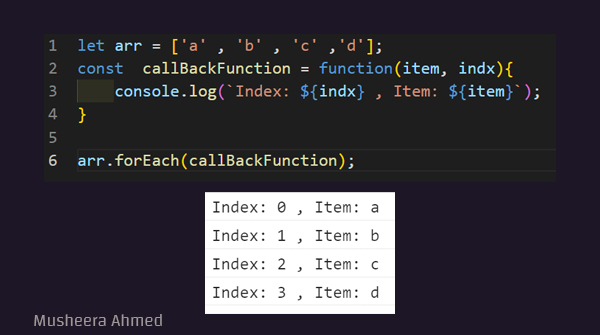 3.الدالة التي يتم استدعائها تستقبل ثلاثة مدخلات الأول هو العنصر الذي سينفذ في الدالة يتبعه ال index ثم المصفوفة (المتغيرين الأخيرين اختياريين)