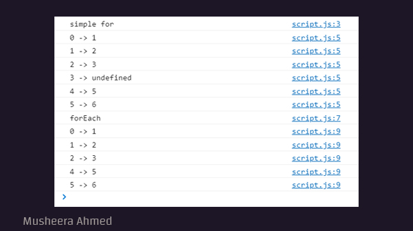 4.لا نستطيع إيقاف forEach عند تحقيق شرط معين حيث ان return, continue and break لا يتم التعرف عليها.