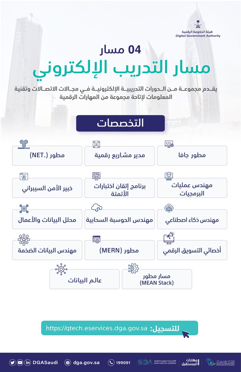مسار التدريب الإلكتروني أحد مسارات برنامج تطوير القدرات الحكومية الرقمية #قدرات_تك لاستهداف الموظفين والباحثين عن عمل بتطويرهم في مجالات الاتصالات وتقنية المعلومات بالتعاون مع #مهارات_المستقبل و @SdaAcademy