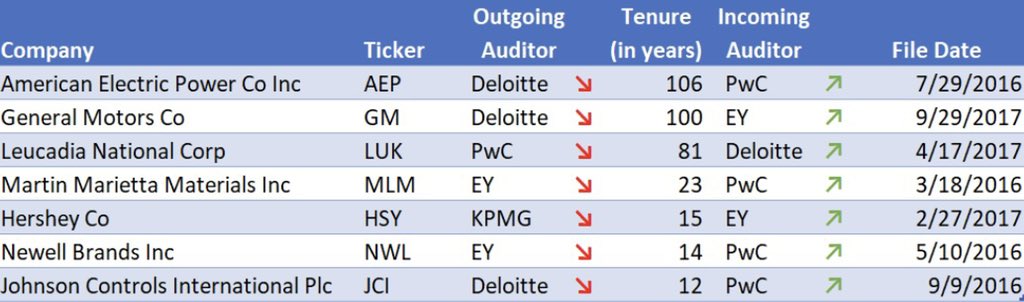 شركة AEP تغير المراجعين بعد ١٠٦ سنوات ! وغيرها من الشركات ايضا لها مدة مقاربة. Harry ركز على الموضوع هذا وظهر له شركة GE تغير مراجعة من KPMG الى Deloitte مع العلم ان KPMG كانت مراجعهم من عام ١٩٠٩ وDeloitte من السنة المالية ٢٠٢١