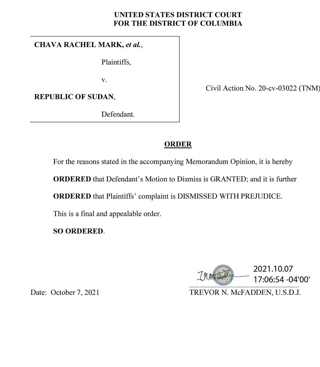 وأشار القاضي انه لا يوجد أي حكم أو تسوية تضمنت اتهام السودان بدعم منظمة حماس.