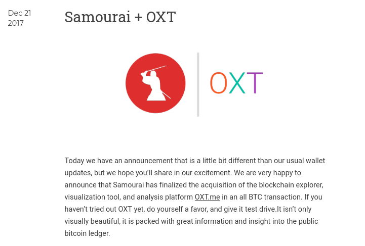 We acquired the OXT project in 2017. Something we were very proud to do, as we successfully outmaneuvered a known adversarial chain analysis company to secure the property as freely available to the public. Democratizing access to analysis software