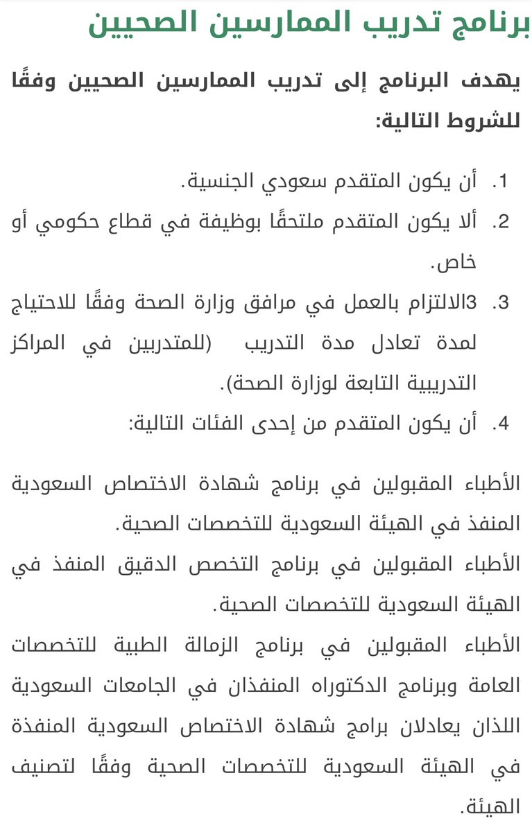 أعلنت #وزارة_الصحة عن بدء التقديم لـ #عقد_طبيب_متدرب والمسمى الجديد له #برنامج_تدريب_الممارسين_الصحيين 👨🏻⚕️✨👩🏻⚕️في موقعها 💻