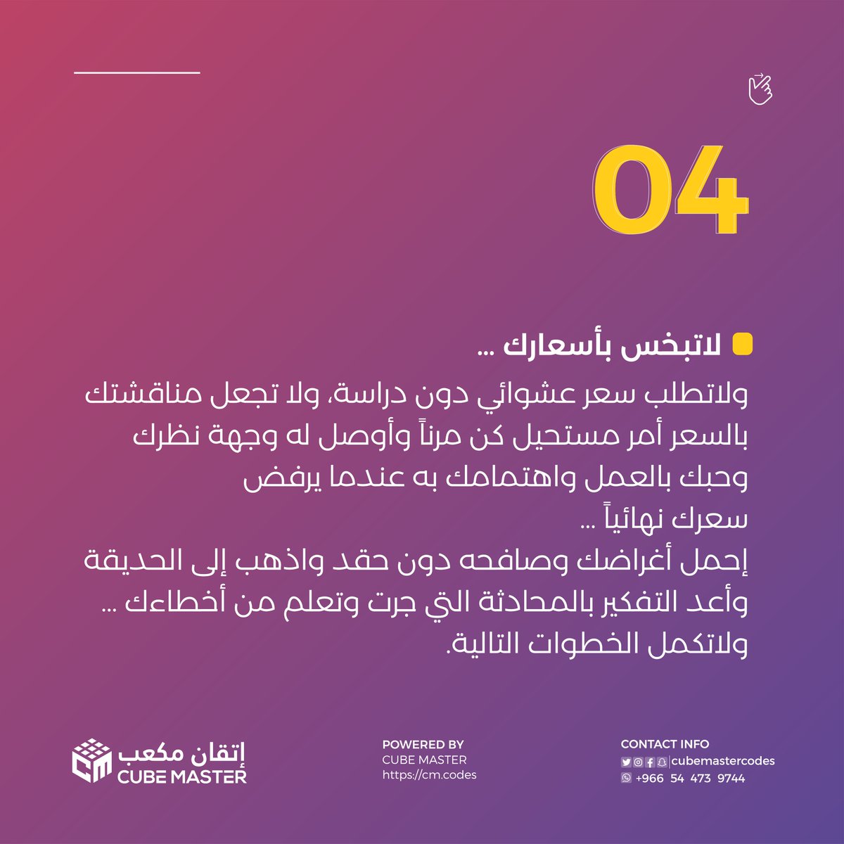 ولاتطلب سعر عشوائي دون دراسة،ولا تجعل مناقشتك بالسعر أمر مستحيل كن مرناً وأوصل له وجهة نظرك وحبك بالعمل واهتمامك به عندما يرفض سعرك نهائياً … إحمل أغراضك وصافحه دون حقد واذهب إلى الحديقة وأعد التفكير بالمحادثة التي جرت و #تعلم من أخطاءك ولاتكمل الخطوات التالية