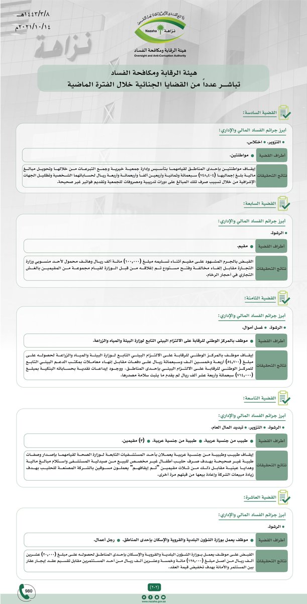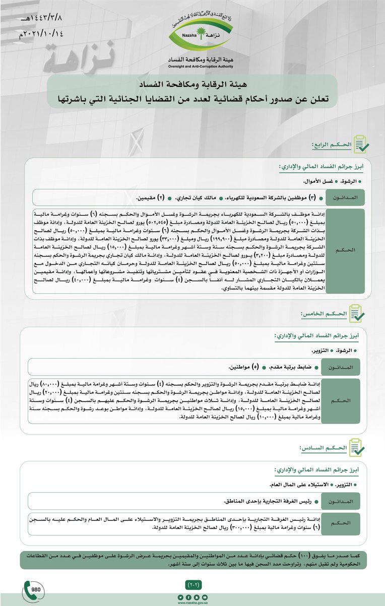 وغرامة بمبلغ 390,000 ريال لصالح الخزينة العامة للدولة، وإدانة رئيس مجلس إدارة إحدى الشركات بجريمة الرشوة والحكم بسجنه سنتين و 6 أشهر وغرامة بمبلغ 20,000 ريال لصالح الخزينة العامة للدولة, وإدانة مقيم يعمل بذات الشركة بجريمة الرشوة والحكم بسجنه سنتين وغرامة بمبلغ 20,000 ريال