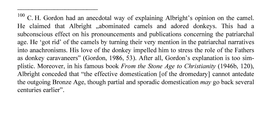 ونحن نعلم أن إبراهيم عليه السلام قدم إلى الشام من مكان بغض النظر عن الخلاف حول خلاف جزيرة العرب. فكون ألبرايت يزعم أن الجمل لم يستأنس في عهد إبراهيم ويعقوب وموسب عليهم السلام، لا يؤيد زعم صاحب اغتوراة الحجازية فألبرايت يزعم أن ذكر الجمل زيد في زمن لاحق وأنه زيد للتمثيل بما يناسب