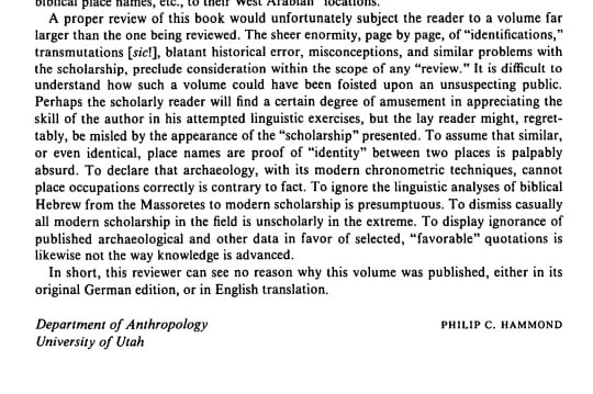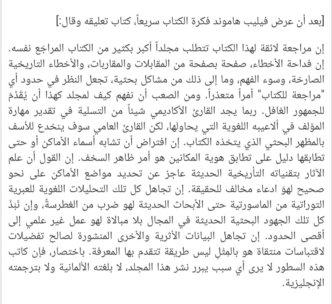 ومما استفدته من الأستاذ @atbuosh نقد هاموند لكتاب الصليبي ، وقد اضطررت لشراء مراجعته بمبلغ 25 دولار من الناشر لأن مكتباتنا العامة للأسف لاتتيح للباحث المستقل الولوج إلى مكانز المجلات المحكمة كما تفعل المكتبات العامة الغربية بكل يسر!.