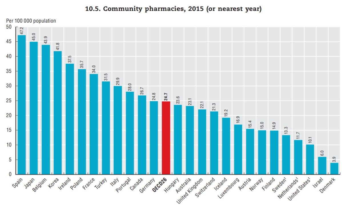 فمع ان امريكا لديها اقل من نصف الصيدليات للسكان مقارنة بكندا، الا ان %90 من الامريكان على بعد 2 ميل او اقل من الصيدلية، مما يعني انه لا مشكلة في الوصول الى صيدلية.