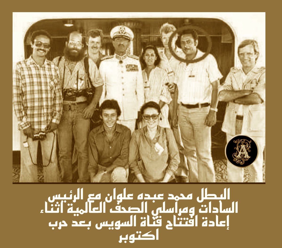 المقاتل "علوان" وهو الثاني من اليمين في صورة له مع الرئيس انور السادات وبعض مراسلين الصحف الأجانب