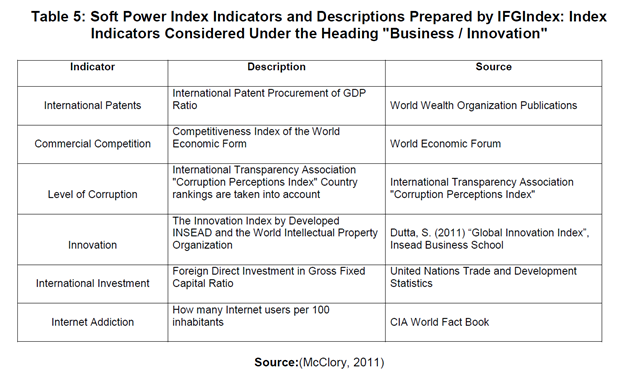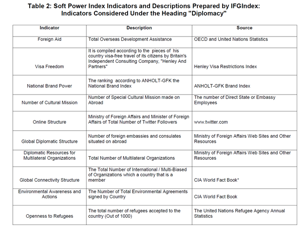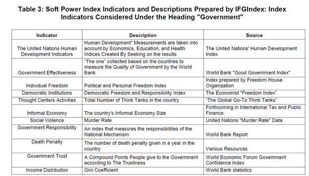 36-ومنها عدد الميداليات الأولمبية، وحالة توزيع الدخل في البلاد، والمنشورات الأكاديمية، وعدد المراسلين الأجانب. يتم تصنيف هذه المؤشرات تحت خمسة عناوين: الدبلوماسية – الحكومة – الثقافة – الأعمال – الابتكار