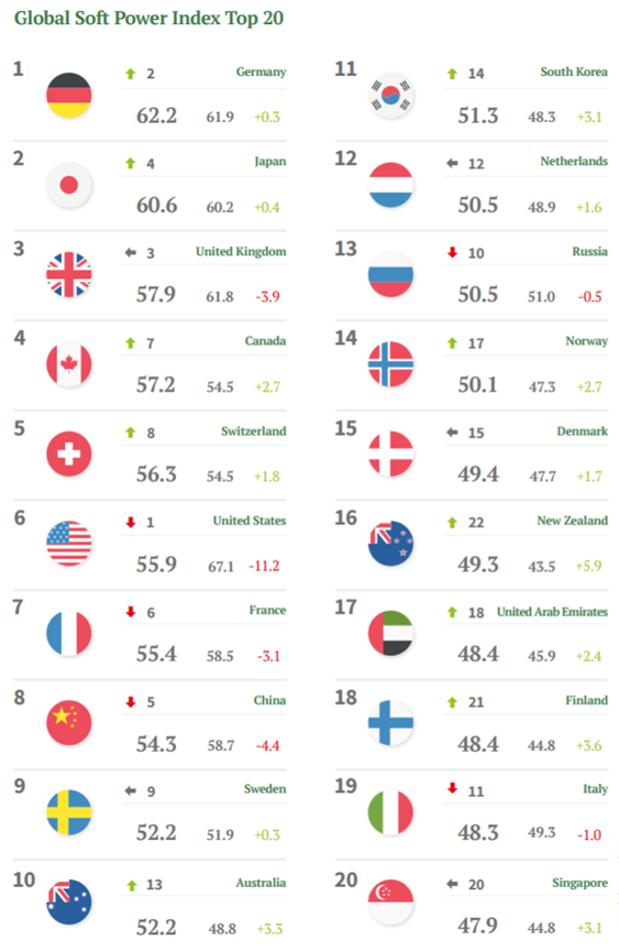 38-المؤشر الثالث Soft Power 30 المطور من قبل شركة بورتلاند الإعلامية في عام 2015 ويستند التصنيف إلى مؤشرات أداء المؤسسات السياسية والجاذبية الثقافية ومتانة الشبكة الدبلوماسية والسمعة العالمية لنظام التعليم العالي وجاذبية النموذج الاقتصادي والتفاعل الرقمي