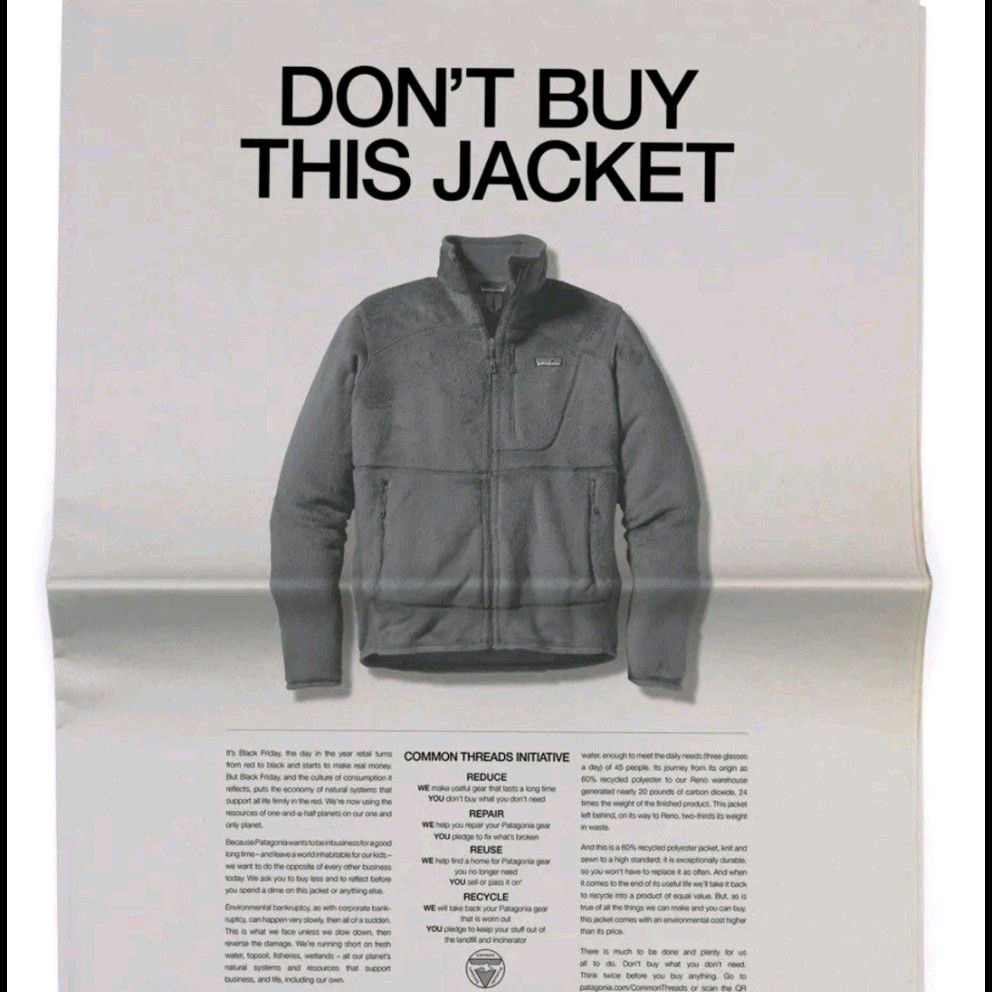 في #الجمعه_البيضاء لعام 2011 في صحيفة نيويورك تايمز، نشرت شركة باتاغونيا العالمية المصنعة للملابس الصديقة للبيئة إعلان تضمن صورة لواحدة من أكثر سترات الصوف مبيعا للشركة تحت عنوان عريض