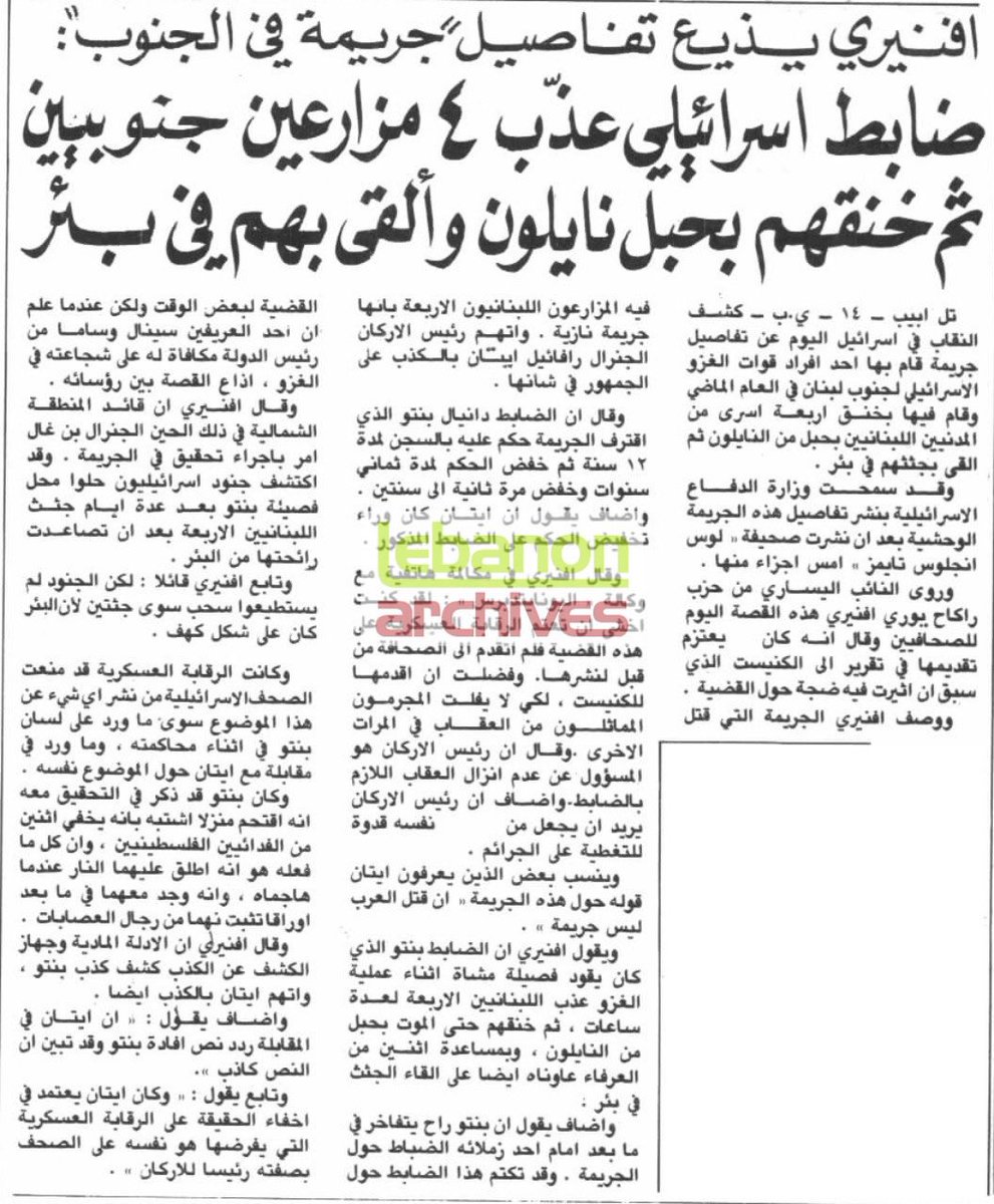 لكن رقيباً رفض تنفيذ الأمر فقام ملازمان ورقيبان آخران بإطلاق النار على الأسير وقتله. عندها قام الرقيب بتبليغ قيادته عن الجريمة. حكم على ساديه بالسجن ٥ سنوات مع تخفيض رتبته إلى جندي لكن إيتان تدخل مجدداً وخفض محكوميته إلى سنتين ونصف مع تخفيض رتبته إلى رائد (أي رتبة واحدة فقط).