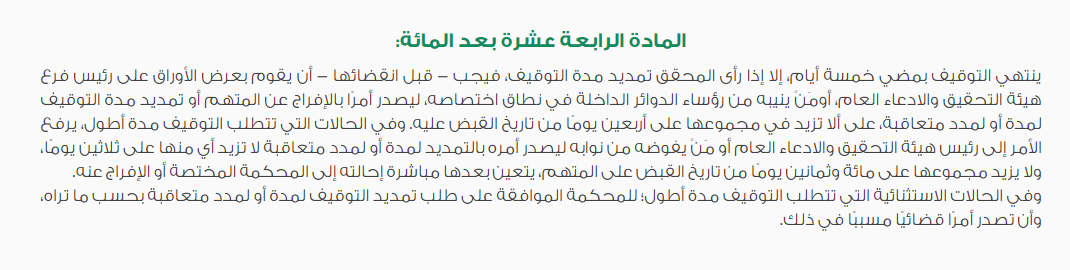 حدد نظام الإجراءات الجزائية 5 أيام فقط لتوقيف المتهم تبدأ من تاريخ القبض عليه، فيما قنن فترة تمديدها بما يعرف بالحبس الاحتياطي إلى 6 أشهر (180 يوماً) كحد أقصى .. إذا كانت مصلحة التحقيق تستوجب توقيفه لمنعه من الهرب أو من التأثير في سير التحقيق ..