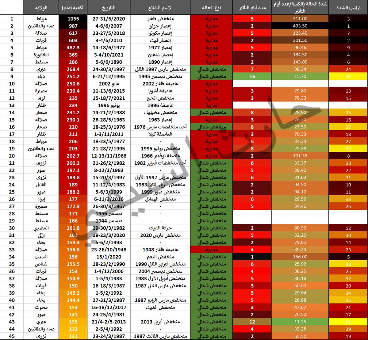 جامع لأغزر الحالات الجوية التي أثرت على عمان وتم توثيقها من خلال محطات الرصد، سأشرح أسفل هذه التغريدة العديد من تفاصيله، على سبيل المثال، جونو هو الأشد ومنخفض ظفار2020 الأغزر و #شاهين ترتيبه الرابع من حيث الشدة وما فرق التأثير بين المداريات والشماليات