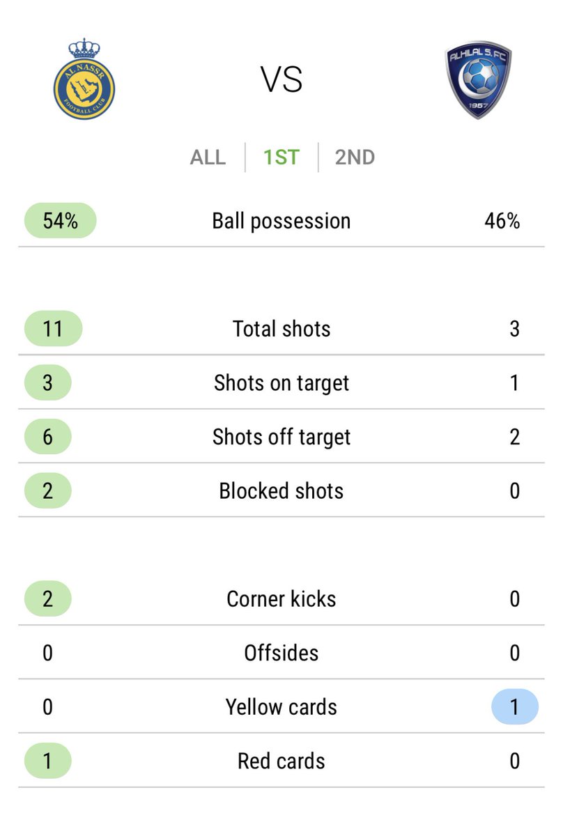 الامور استمرت بتفوق واضح للنصر وتراجع من الهلال حتى نهاية الشوط عندما قام لاجامي بتقديم هدية ثمينة لـ الهلال