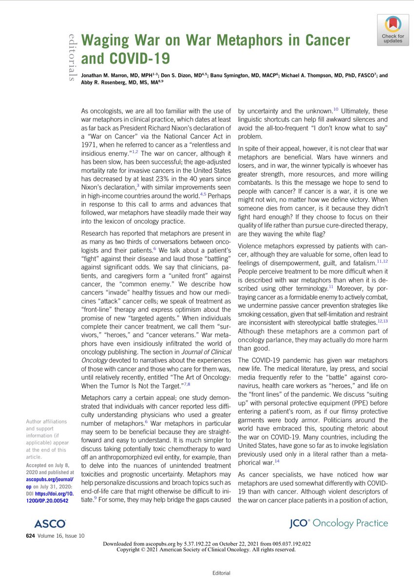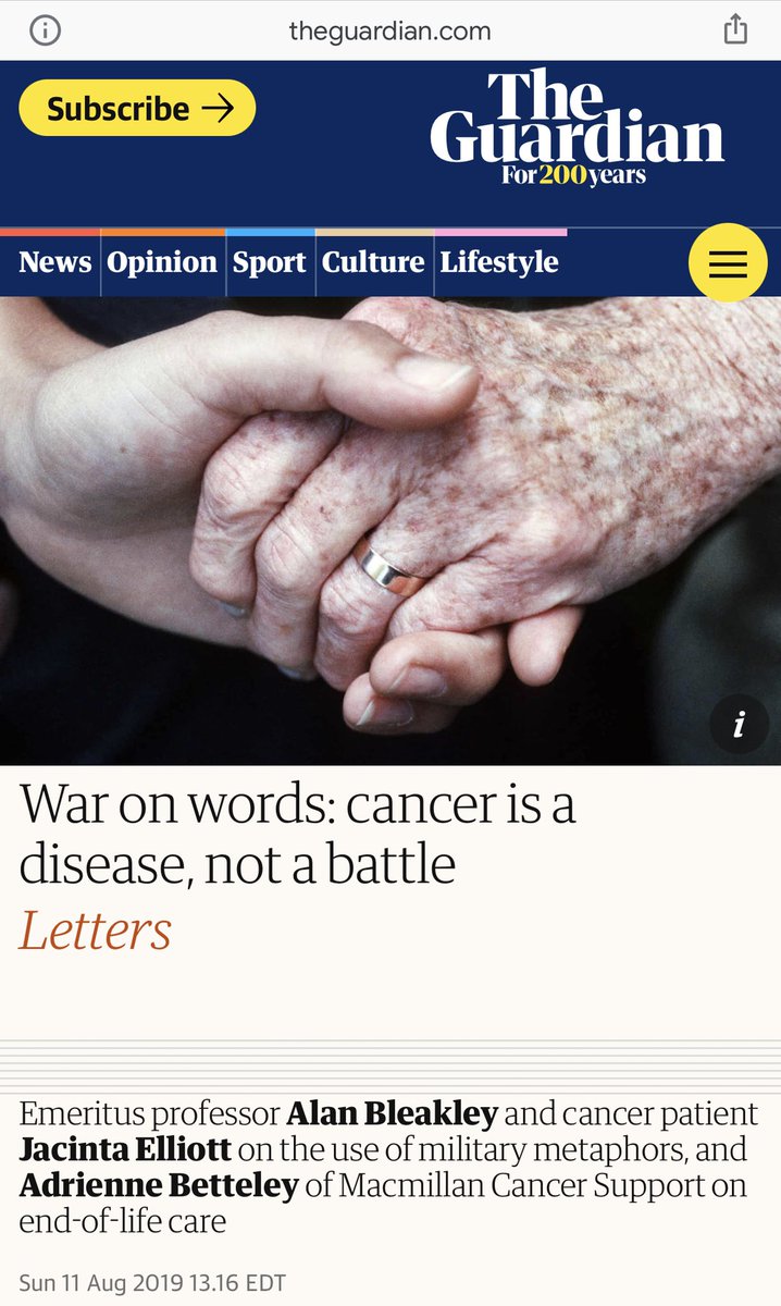 ١٨- نشرت صحيفة الغارديان (٢٠١٩) مقالا عنوانه: "الحرب على الكلمات: السرطان مرض وليس معركة" ليؤكد فيه البروفيسور آلان بلايكلي ومريضة السرطان جاسينتا إليوت على عدد من التأثيرات السلبية لاستخدام هذه المصطلحات ليس فقط على المريض ولكن أيضا الطاقم الطبي
