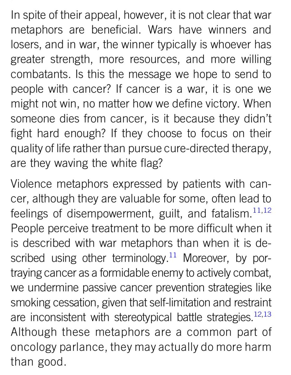 ١٥- وفي مراجعة علمية للموضوع ذاته (Marron, 2020)، يتساءل الباحثون إن كانت حربا على السرطان، فمن الخاسر؟ وهل من يركز على جودة الحياة يعتبر مستسلما؟ كما أن هذه المصطلحات تشعر المريض بالضعف والذنب وقلة الحيلة، ويخلصون إلى أن هذه المصطلحات تؤذي وتضر المريض أكثر مما تنفعه