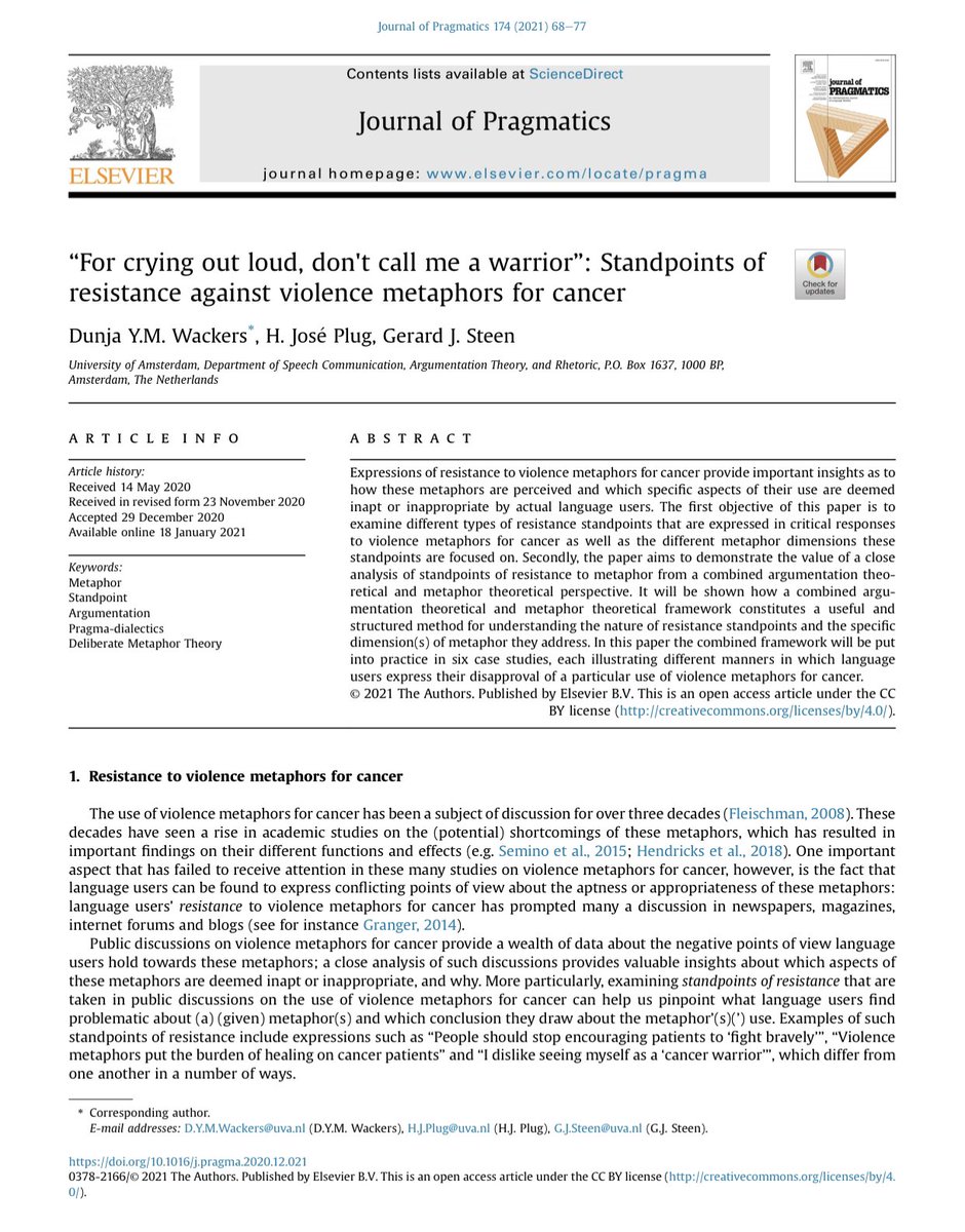 ١٦- في دراسة لأسباب ممانعة مرضى السرطان لمصطلحات المواجهة والقتال، عنون الباحثون (Wackers, 2021) المقال: "أصرخ عاليا؛ لا تقل أني محارب" حيث بحثت الدراسة في أسباب موقف الممانعة لهذا الوصف من وجهة نظر المرضى