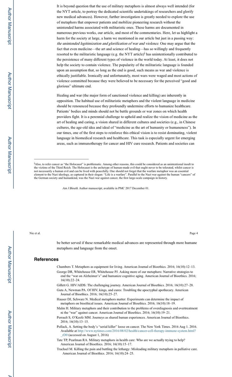 ١٧- وفي دراسة (Nie, 2016)، أبرز الباحثون حجتهم في عدم قبول استخدام مصطلحات القوة والعنف والقتال في الطب للتعامل مع الأيدز كمثال، وأن مثل هذا الاستخدام غير أخلاقي ويتنافى مع طبيعة الطب والعلاج للمرضى، ودعوا إلى لغة أكثر سلمية وإنسانية