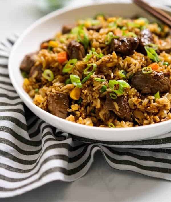 ارز مع قطع اللحم والخضار 🤍