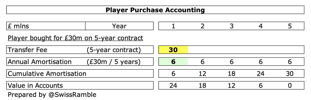 لا يتم دفع رسوم الإنتقال كاملةً في السنة التي تم شراء اللاعب فيها، لكن بدلاً من ذلك يتم توزيعها بالتساوي على مدة عقد اللاعب من خلال نظام الإستهلاك [ أي المال الذي سيُسدد لاحقًا ]