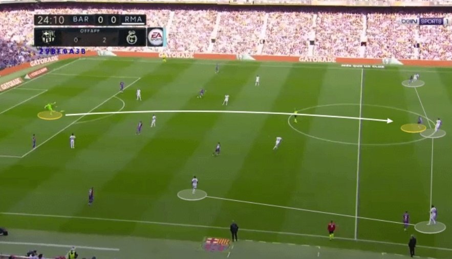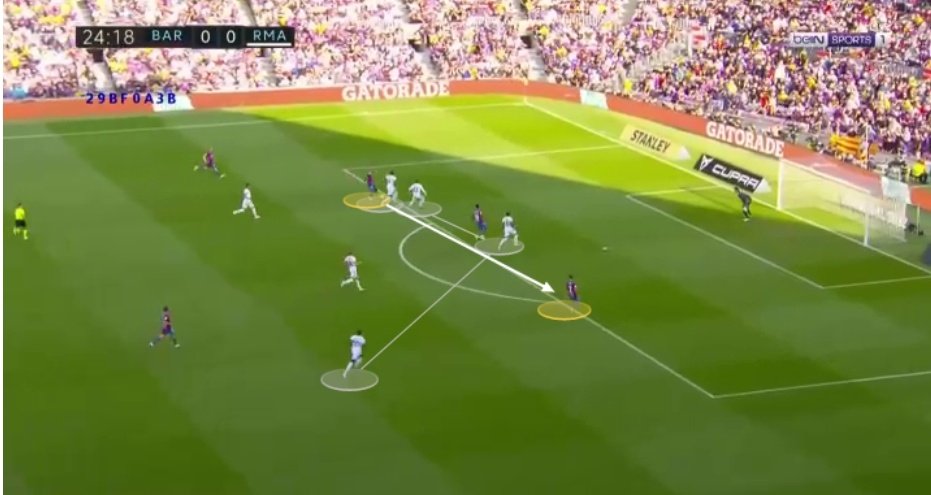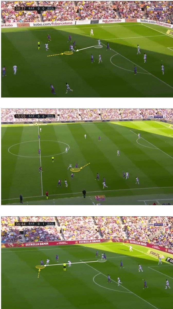 من ناحية أخرى، لم يكن الريال متماسكًا في ضغط خط الوسط. لقد بدوا مفككين، حيث لم يتقدم كاسيميرو إلى بوسكيتس، كما كان الحال في الكلاسيكو السابق، لكن بدلاً من ذلك سلم تلك المسؤولية إلى توني كروس أو لوكا مودريتش، حيث انتقل إلى فرينكي دي يونج أو جافي.