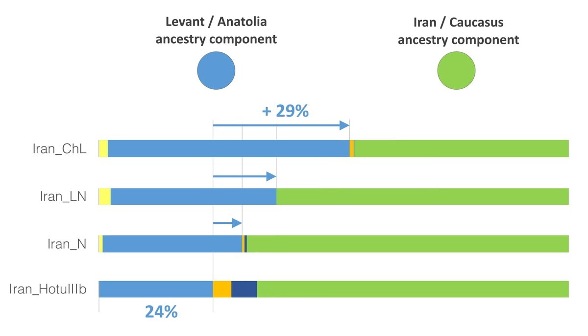 حيث تمددت الأصول الشامية الأناضولية نحو إيران بنسبة %29 بين الفترة الميزوليثية والنحاسية